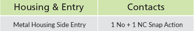 • Contacts: Snap Action 1 NO + 1 NC